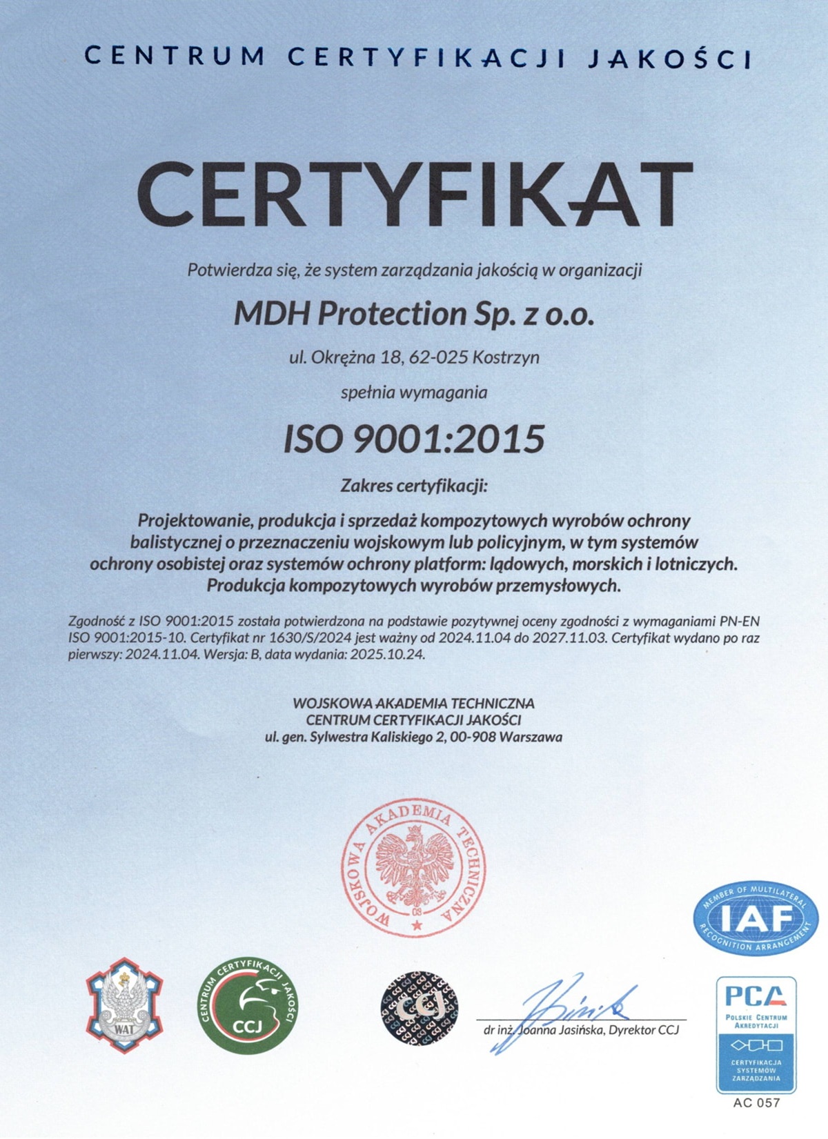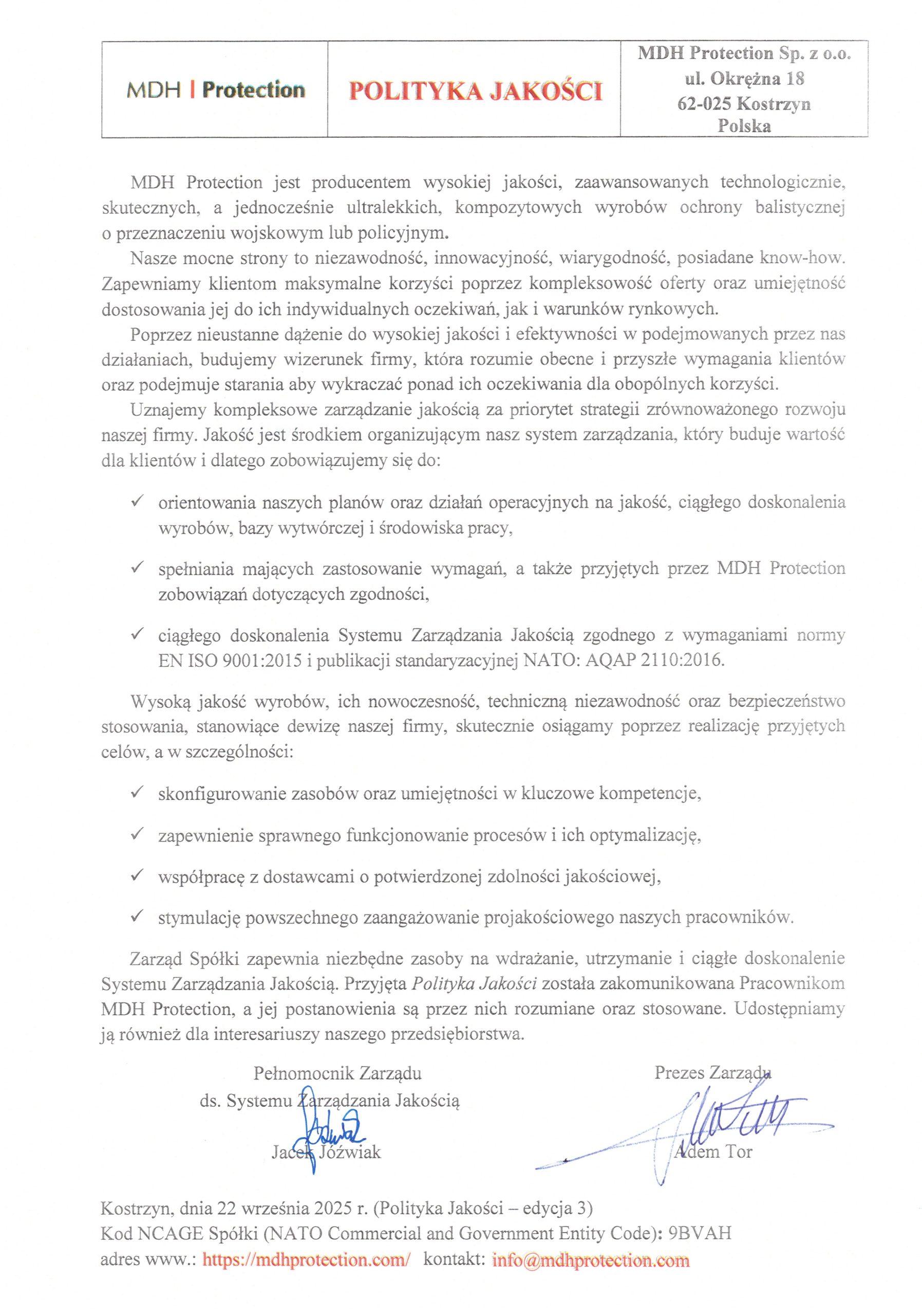 W MDH Protection naszym priorytetem jest ochrona życia i zapewnienie bezpieczeństwa naszym klientom. Dążymy do doskonałości, uczciwości i odpowiedzialności społecznej. Staramy się być liderem w dziedzinie rozwiązań ochrony balistycznej.